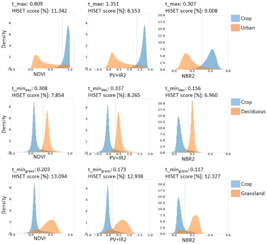The and index composites have been processed for each spectral index (NDVI, PV+IR2 and NBR2) and per S2 tile (see also Table 2). HISET thresholds and scores are derived for each of the S2 tiles and for a spatial mosaic of all tiles. Figure 5 shows the histogram plots for all pixels covering the selected LC types in the complete test area. For t_, the crop pixels are compared with the urban pixels. has been created in two versions, (1) by comparing crops with deciduous trees and (2) by comparing crops with grassland. Figure 5 shows histogram overlaps for all indices and thresholds. For calculating t_, the index composite is used, where crops shall be in a photosynthetic-active state and, therefore, well separable from urban areas (upper row). The overlap happens when urban LC pixels are also covering urban green. The HISET score for PV+IR2 is 8.2% and, thus, has the lowest score value. The highest score can be found for NDVI (11.3%). Independent from the index, deciduous (middle row) and grassland (lower row) index values show clear differences. Compared to grasslands, histograms of deciduous show minor overlaps, resulting in thresholds with HISET scores between 7.0% and 8.3%. For grassland, a bimodal and wider distribution of index values can be observed for all indices. It highlights the above-described spectral similarity of NPV and bare soil that cannot be fully separated using multispectral data, especially when the NPV-containing LC is in a dry condition (first local maximum). Although the HISET score is higher than for deciduous trees, each index’s threshold is defined as lower, resulting in fewer pixels that are selected for building the SRC. Thus, fewer disturbance effects are expected. Comparing the three used spectral indices, the HISET score for NBR2 is the lowest for both versions.