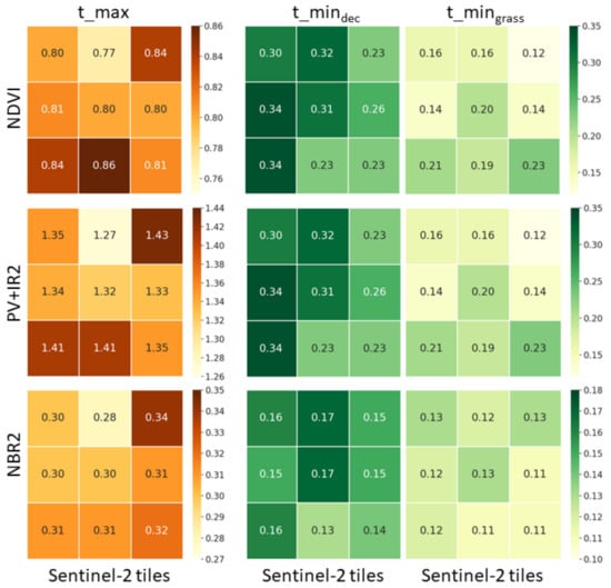 In the next step, the derived HISET thresholds and scores have been analysed to reveal potential dependencies on specific LC characteristics of each S2 tile. The distribution pattern (left column of Figure 6) is similar for NDVI and PV+IR2 since the index calculation is similar (see Table 1). At the same time, values for S2 tile 32UPA are the lowest for each of the indices. Threshold differences between and are obvious, and similarities between NDVI and PV+IR2 are visible. NBR2 shows different spatial patterns for both versions. An S2 tile-based variability of HISET scores can also be observed (see Figure A1). To clarify, if the derived HISET values are related to the percentage of occurring LC type pixels, a preliminary multiple regression analysis (MRA) has been performed by defining the HISET score or threshold as a predictor and the two respective LC types as coefficients. The test has been performed by considering all nine S2 tiles. The coefficients of determination, R2, for all tests are below 0.52, with a mean R2 for all thresholds and indices of 0.30. The results show no measurable relationship between the percentages of LC types used to derive the HISET parameter.