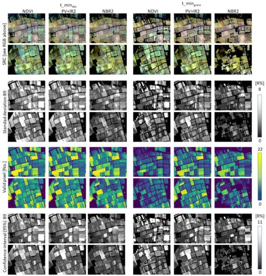 A closer look at examples A and B shows that the resulting composites differ in spatial coverage and spectral variability, driven by the selection of the number and type of valid pixels. In principle, the number of valid pixels is higher for all versions independent from the index. This is in line with the generally lower threshold values for the listed in Table 3. Since the valid pixel images show patterns related to the fields, it can be assumed that the occurrence of bare soil pixels is related to the crop type. This effect is visible for each of the indices and versions. In the examples in Figure 7, the NBR2/ parameter combination produces the least coverage of SRC pixels. However, for the entire test side, the PV+IR2/ combination shows the lowest coverage of bare soil pixels (Table 3), while the mean number of valid pixels is slightly higher compared to NBR2/ (16.19% vs. 15.76%). From all versions, NBR2 resulted in the highest coverage of bare soil pixels (29.64%). The number of LUCAS points that are covered by the SRCs is similar for and versions, respectively.