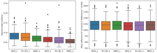 The summarised spectral angle statistics show a gradient from NDVI, PV+IR2 to NBR2 for all versions. The best match can be found for the NBR2/ version with a mean spectral angle of 0.058, which marks a drop of more than 30% compared to the highest spectral angle value calculated for the NDVI/ version. Additionally, the interquartile range of SRC/ versions is smaller compared to the SRC/ versions, with the smallest interquartile range of the NBR2/ SRC. In contrast, the calculated mean reflectance differences do not show significant changes across the SCR versions.