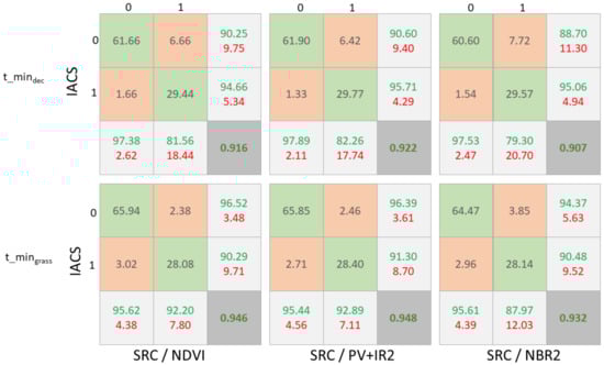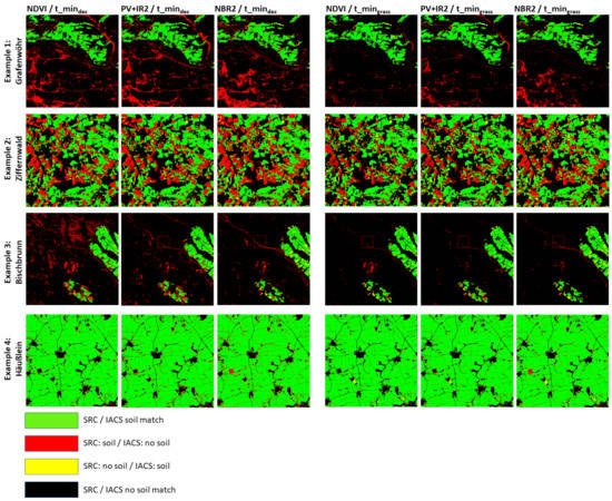 The external IACS database containing land parcel-specific crop types has been used for the quantitative validation of the bare soil area. It is a European database containing all agriculturally used areas and is updated yearly (see Section 2.5). The derived mask of bare soils is compared to the bare soil mask of the SRCs to perform a simple pixel-wise accuracy assessment. It comprises true and false positives and true and false negatives for the entire test area available as an image product and as a confusion matrix (Figure 4).