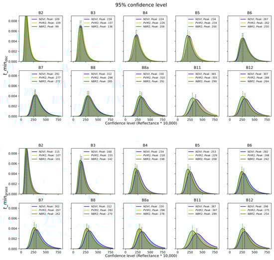 A wide range of strategies can be found in selecting the spectral index, and the threshold derivation technique. In a wide range of studies, the well-known normalised difference vegetation index (NDVI) is often used [35] to separate the photosynthetically active areas (PV) from the non-active areas (NPV). Refs. [13,20] used an NDVI of <0.27, and [14] used an NDVI of <0.25, followed by other spectral indices to account for the above-described disturbance factors. Ref. [14] tested different empirically derived normalised burn ratio II (NBR2) thresholds (0.025–0.350) for a test area in Brazil using laboratory soil spectra. Ref. [25] expanded this technique by using LUCAS top-soil spectral measurements to derive NDVI ( to 0.30) and NBR2 ( and 0.15) thresholds. Ref. [31] uses empirically derived thresholds from NDVI (<0.20) and the bare soil index (BSI) of >0.08 for test areas in Italy. Ref. [18] applied the BSI threshold (<0.021) that has been derived using airborne imaging spectrometer data from the Airborne Prism Experiment (APEX). Ref. [19] combined NDVI and NBR2 and tested different index ranges by selecting the optimum threshold based on the best correlation between resampled LUCAS spectra and SRC spectra. Ref. [15] developed a new index specifically for Landsat that combines the NDVI with a ratio of the near-infrared (NIR) and blue band to account for cloud artefacts that remain after cloud removal. The index thresholds have been derived using manually defined percentile measures. They have been proven stable across different years but not across different biogeographic regions in Germany. Thus, it has been found that percentiles are not transferable and strongly depend on the test site characteristics [30]. This manual step should be avoided for operational processors to reduce human intervention during processing to a minimum.
