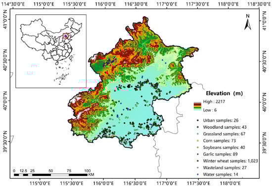 Geographical location and DEM of Beijing (DEM: Digital Elevation Model, data provided by Shuttle Radar Topography Mission), and distribution map of classes samples that exist in study area. Specifically, a total of 1023 winter wheat samples with the area of 8,658,500 square meters were collected (selection of other classes can be seen in Section 2.2.2).