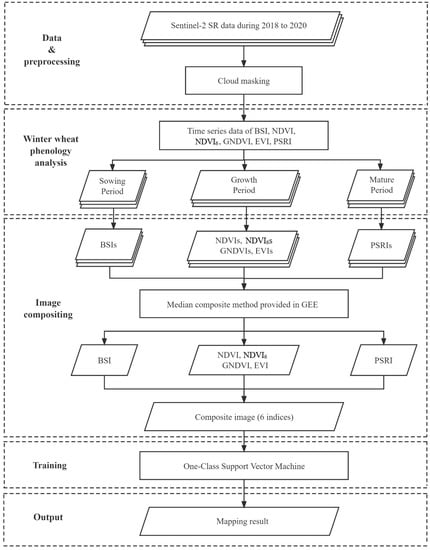 Another issue in using phenological features to map winter wheat in fine-resolution images is the selection of vegetation index. In some previous studies, a single vegetation index temporal profile was used to identify winter wheat in multiple phenological periods [,,]. Normalized Difference Vegetation Index (NDVI) was the vegetation index used in the mentioned studies, and its applicability as the most widely used vegetation extraction method at present is beyond doubt. However, if only a single NDVI time series data is used to extract the winter wheat area during the whole phenological period, the classification result will be affected if the spectral index temporal series data profile of other vegetations is similar to winter wheat []. To enhance the spectral separation between winter wheat and other vegetation, it is necessary to introduce different vegetation index combinations in multiple phenological periods to improve the accuracy of winter wheat mapping. Therefore, using multiple vegetation indices is the mainstream method of identifying crops in recent studies [,,]. In study [], it defined four key phenological periods of winter wheat in North China Plain based on the simulated Vegetation Index (VI) time series data. Paper [] developed a vegetation index–phenological index (VI-PI) classifier to map the interannual change of maize planting area in the Hetao irrigation area of North China from 2003 to 2012.