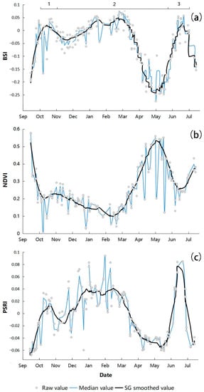 In order to draw accurate spectral indices temporal profiles of winter wheat, we used data from pure winter wheat pixels (150 ROIs, evenly distributed throughout the winter wheat field of the Beijing region) obtained from visual interpretation of very high-resolution images on Google Earth. For each pixel, 3 spectral indices temporal profiles were obtained by calculating BSI, NDVI, and PSRI vegetation indices. As shown in Figure 4, the data in the figure were calculated from all available Sentinel-2 images during the study time range (mid-September 2018 to mid-July 2020) after cloud masking. Grey dots represent the raw indices values, blue lines represent the median values of raw indices on the same day, and black lines are the raw values smoothed by the Savitzky-Golay (SG) filter []. In the parameter setting of the SG filter, we combined the actual situation and referred to the method in previous studies [,], and set the smoothing window as 10 and the degree of smoothing polynomial as 3.