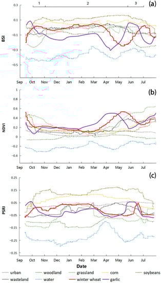 The study area in this work is the whole region of Beijing, the land cover types of it include urban area, woodland, grassland, an agricultural area, wasteland, and water. The urban area occupies the majority of the study area, its spectral profile is gentle without obvious phenological changes. The woodland in Beijing is mostly deciduous broadleaved [], it begins to grow in spring and withers in winter, as does the grassland. Therefore, the lowest value of NDVI is in winter, it gradually rises in spring to summer, and reaches its peak in summer. The products planted in the Beijing agricultural area include winter wheat, corn, soybeans, and garlic [,]. Corn and soybeans are sown after the winter wheat harvest and harvested before the winter wheat sowing. In other words, the phenological characteristics of corn and soybean have complete distinctions from those of winter wheat. They do not grow in the growth cycle of winter wheat, so no matter the spectral profile of BSI, NDVI, or PSRI, they all tend to be stable. However, garlic is sown slightly later and harvested slightly earlier than winter wheat, which is always sown from late September to early October, wintered in December and January, and harvested from late May to early June of the following year [,]. Therefore, the phenological characteristic of garlic is similar to that of winter wheat, and it can be clearly seen from the spectral profiles that garlic reached the peak of BSI, NDVI, and PSRI earlier than winter wheat, which affected the classification accuracy of winter wheat to a certain extent. The spectral indices temporal profiles of different land cover types (pure pixels of each type selected from validation data, detailed selection of each validation data can be seen in Section 2.2.2), which were smoothed after SG filter in a full growth period of winter wheat, were drawn in Figure 5. The smoothing window of the SG filter used was 30 and the degree of smoothing polynomial was 3.