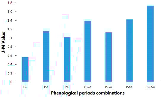 It should be noted that the J-M value which used the phenological period of “growth” was higher than other combinations with the same number of phenological periods. For example, in a single phenological period spectral separability evaluation, P2 is higher than P1 and P3. When two phenological periods were used, the combination of P1,2 and P2,3 were higher than P1,3. Therefore, fully representing the phenological characteristics in a growth period is necessary to identify winter wheat in mapping work.