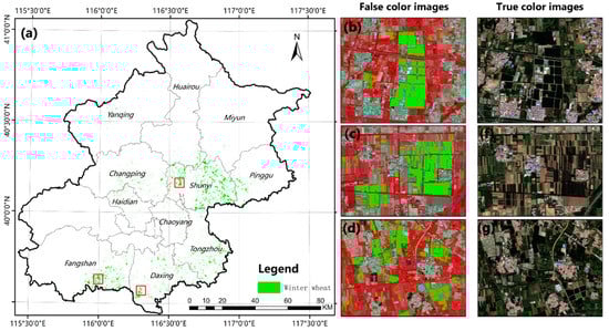 Spatial winter wheat distribution of Mpsf map in Beijing. Sub-images on the right represent the identification of winter wheat in Fangshan District, Shunyi District, and Daxing District, respectively, and their specific position is indicated by red boxes in (a). The background images of (b–g) are Sentinel-2 data, which were taken on May 12, 2020. The three-band combination in (b–d): NIR, red, green. The three-band combination in (e–g): red, green, blue.