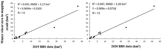 In comparison with the winter wheat data provided by BBS, we used two spatial dimension comparison methods: city-level and district-level. In the city-level method, we compared the winter wheat area of the whole of Beijing in the Mpsf map with statistical data from BBS and used RE to measure the accuracy. In the comparison of the district-level, we used the coefficient of determination (R2) and root mean square error (RMSE) to evaluate the winter wheat area correlation between the Mpsf map and BBS in 11 districts (Figure 9).