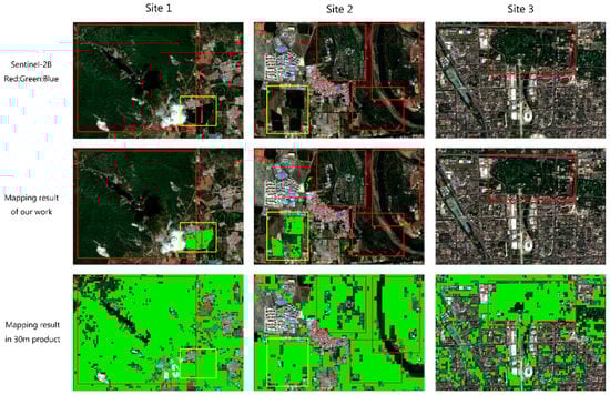 Finally, in comparison with 30-m of mapping product, we firstly compared the whole winter wheat area in Beijing of this product and the Mpsf map with the data provided by BBS. Then, for the purpose of visual interpretation and specific classification results comparison of these two maps, we superimposed them on Sentinel-2 images, respectively.
