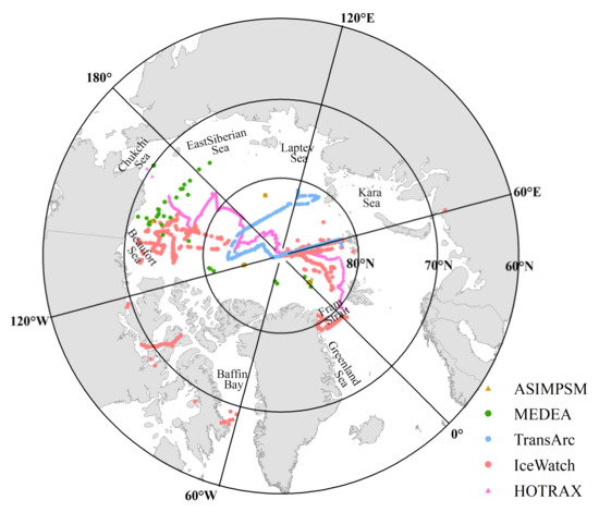 The Trans-Arctic survey of the Arctic Ocean in transition (TransArc) dataset was derived from hourly visual observations of sea ice conditions (e.g., sea ice type, sea ice thickness, sea ice concentration, and MPF) acquired by the Polarstern icebreaker from August to September 2011 [34]. The Healy Oden Trans-Arctic Expedition (HOTRAX) dataset was compiled from measurements of ice station, ship, and helicopter aerial images acquired every two hours [9]. In this study, the HOTRAX data acquired at 69.55–89.98°N from August to September 2005 was used for validation.