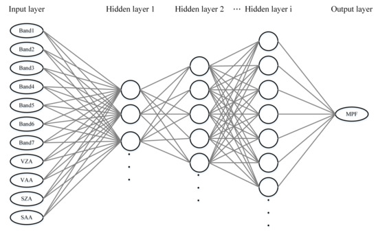 The objective output variable was the MPF of the Arctic sea ice. It has been widely reported that the snow, melt ponds, and ocean water are non-Lambertian, and the directional surface reflectance of Arctic sea ice varied significantly with the incident/viewing geometries [4,64]. To capture the reflectance anisotropic properties, the incident/viewing geometries were used as input variables for establishing the relationship between surface reflectance and shortwave surface albedo of Arctic sea ice using an ensemble back-propagation neural network [65].