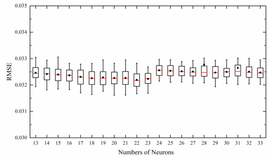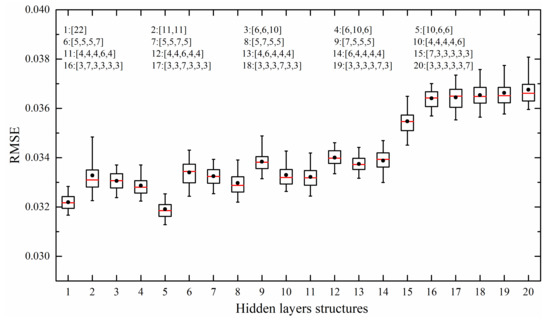 The results of the experiment show that the minimum value of the median root mean square error (RMSE) occurred when the total number of neurons was 22 (the neural network model for May; Figure 4). When the total number of neurons was 22, 20 hidden layer structures could be obtained: (22), (11, 11), (6, 6, 10), (6, 10, 6), (10, 6, 6), (5, 5, 5, 7), (5, 5, 7, 5), (5, 7, 5, 5), (7, 5, 5, 5), (4, 4, 4, 4, 6), (4, 4, 4, 6, 4), (4, 4, 6, 4, 4), (4, 6, 4, 4, 4), (6, 4, 4, 4, 4), (7, 3, 3, 3, 3, 3), (3, 7, 3, 3, 3, 3), (3, 3, 7, 3, 3, 3), (3, 3, 3, 7, 3, 3), (3, 3, 3, 3, 7, 3), and (3, 3, 3, 3, 3, 7).