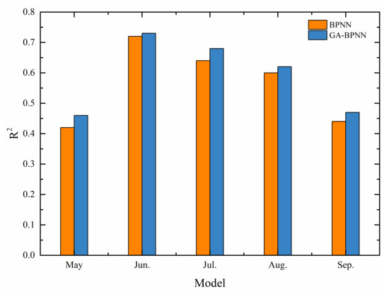 Moreover, a genetic algorithm [66] was also used to optimize the values of the weights and biases in the BP neural network model and to minimize the prediction errors due to the random assignment of weights and biases. The results show that the performances of the BPNN models were significantly improved by the genetic algorithm, and the determination coefficients (R2) of the GA-BPNN models (0.46, 0.73, 0.68, 0.62, and 0.47 for May to September, respectively) were higher than those of the BPNN models (0.42, 0.72, 0.64, 0.6, and 0.44 for May to September, respectively) (Figure 6).
