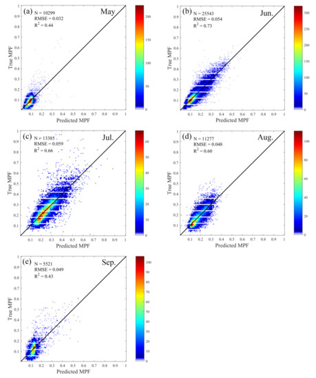 The validation results exhibit relatively lower R2 values for May and September, which is mainly because the MPFs in May and September are much lower than those in June, July, and August, and larger uncertainties in the MPF can be obtained when the MPF is lower.