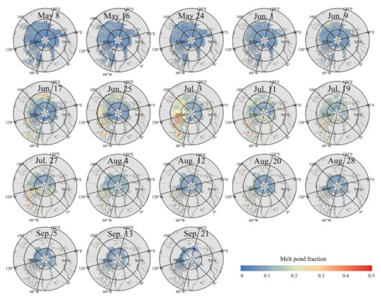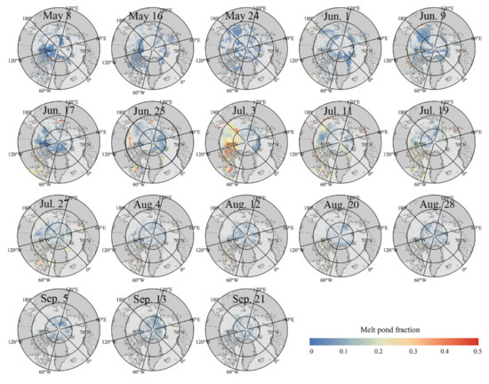 From May to early June, the MPFs were relatively low, and the melt ponds mainly appeared in the northern coastal areas of Asia and North America. Then, from mid-June to mid-July, the MPFs increased significantly in the first-year ice zone (Beaufort Sea, East Siberian Sea, and Laptev Sea) as the air temperature increased. Finally, from late July to September, the MPFs decreased significantly and reverted to the level during the pre-melting season.