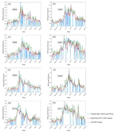 However, because the MPF of Arctic is highly spatiotemporally dynamic and has large inter-annual variability, the MPF climatology was not used in this study, and the missing data were mainly filled based on the relationships between neighboring days. It is clear that the MPFs of neighboring days are closely correlated, and this can be explicitly expressed as a linear relationship [67]: