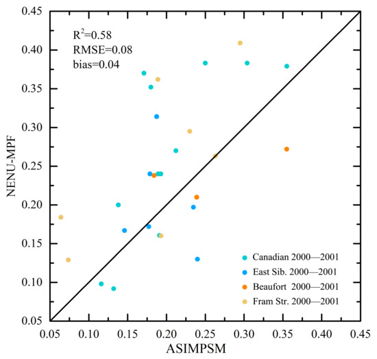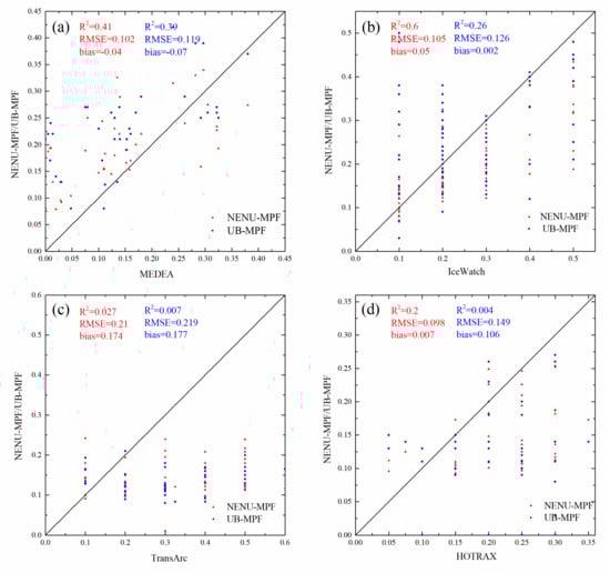 The results of the validation against the UB-MPF dataset indicate that it has an accuracy comparable with that of the NENU-MPF dataset and is roughly consistent with the MEDEA (R2 = 0.39, RMSE = 0.119, and bias = −0.07), IceWatch (R2 = 0.26, RMSE = 0.126, and bias = 0.002), TransArc (R2 = 0.007, RMSE = 0.219, and bias = 0.177), and HOTRAX (R2 = 0.004, RMSE = 0.149, and bias = 0.106) datasets. The satellite-based measurements (ASIMPSM and MEDEA datasets) are more consistent with our results than with the ship-based measurements (IceWatch, TransArc, and HOTRAX datasets). We also found that the TransArc dataset is not consistent with the NENU-MPF and UB-MPF datasets, which is mainly due to the discrepancy between the spatial resolutions of the remote sensing datasets (12.5 km) and the footprints of the ship-based measurements (50 m to 10 km, which mainly depends on the horizontal visibility and height of the observation position).