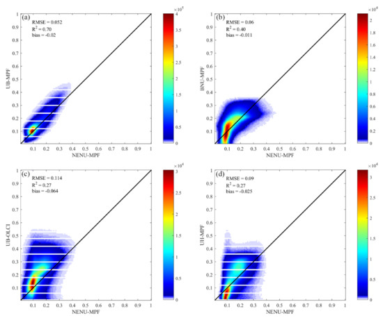 Moreover, the temporal variations in the NENU-MPF dataset are similar to the reference UB-MPF dataset, which indicates that the MPF data missing due to cloud obscuration can be well reconstructed using the statistical-based temporal filter. Figure 12 presents a comparison of the gap-filled MPF with the reference UB-MPF dataset. The comparison results show that the gap-filled MPF derived using the statistical-based temporal filter is consistent with the UB-MPF dataset, with an R2 of 0.43, an RMSE of 0.047, and a bias of −0.022. Its accuracy is lower than that of the GA-BPNN model. However, with the advantage of generating spatiotemporally continuous dataset, the reconstruction accuracy of the statistical-based temporal filter is acceptable at most times.