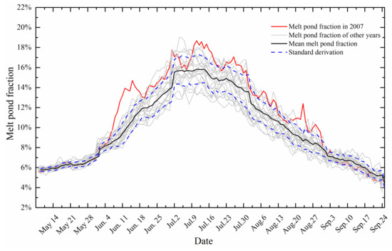 In addition, the UH-MPF dataset exhibits an approximate one-month lag in the decline of the MPF, which is not consistent with the other three datasets. The temporal variations in the MPF of the Arctic sea ice derived from the NENU-MPF datasets from 2000 to 2020 are shown in Figure 18. The regional mean MPF varies from approximate 6% to 20% exhibits a large standard derivation from late June to early August. The newly generated NENU-MPF dataset accurately characterizes the temporal evolution of the MPF and captures the phenomena of abnormal high MPF values in 2007.