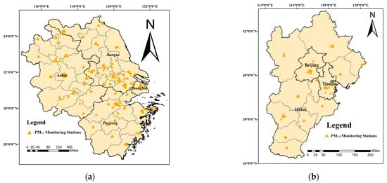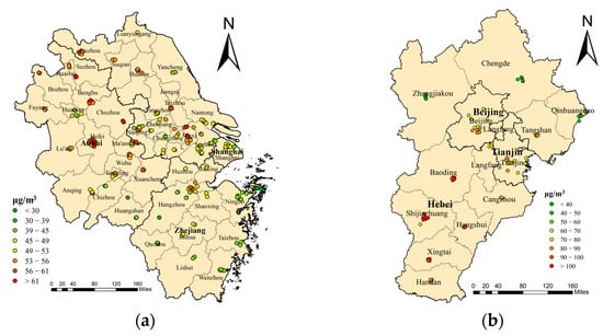 Distribution map of the annual average PM2.5 observations: (a) the YRD region; (b) the BTH region.