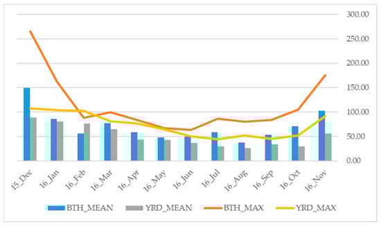 Figure 6 shows the monthly PM2.5 concentrations in the two regions obtained from the PM2.5 estimates distribution maps. The monthly PM2.5 concentrations in the two regions varied in a U-shape, with higher PM2.5 concentrations in the winter months and lower PM2.5 concentrations in the summer months. The most and least polluted months in the YRD were December 2015 and July 2016, when the average PM2.5 concentrations reached 71.95 and 25.34 μg/m3, respectively. In the BTH region, the air was most polluted in December 2015, when the average PM2.5 concentrations reached 139.64 μg/m3, and the cleanest month was August 2016, with an average PM2.5 concentrations of 37.79 μg/m3.