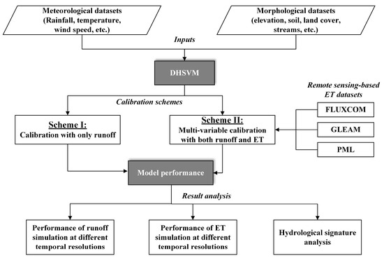 The flow chart of this study is shown in Figure 2. First, the accuracy of the three remote sensing-based ET datasets (FLUXCOM, GLEAM, and PML) is evaluated based on in situ observations of pan evaporation. Second, two calibration schemes, i.e., calibration with only runoff (Scheme I) and multi-variable calibration with both runoff and remote sensing-based ET datasets (Scheme II), are used to calibrate the parameters of the DHSVM model. Third, we compare the hydrological model performance based on Scheme I and Scheme II through the runoff and ET simulation at different temporal resolutions and hydrological signature analysis. Finally, we can draw a conclusion regarding whether incorporating remote sensing-based ET datasets into multi-variable calibration can improve the hydrological model performance in humid regions of East China.