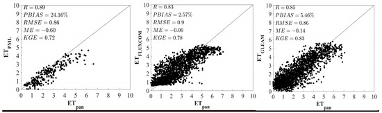 Comparison of the daily ET data derived from three remote sensing-based datasets with in situ observations of pan evaporation.
