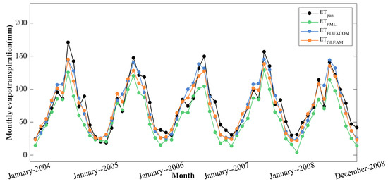 Temporal comparison of monthly ET between remote sensing-based datasets with in situ observations of pan evaporation.