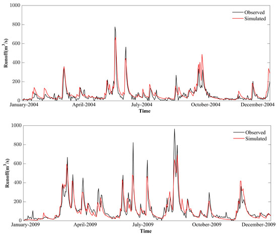 Figure 5 displays the comparison of simulated and observed daily runoff for 2004 and 2009, which is used to represent the calibration and validation periods, respectively. The reason for selecting 2004 and 2009 as the representative years is that the hydrological characteristics of these two years are similar to the calibration and validation periods, respectively. Furthermore, using only one representative year in the figures is beneficial to compare the runoff observations and simulations clearly. As shown in Figure 5, the simulated runoff is very close to the observed runoff in the calibration period, of which almost all peak flows can be captured well. Meanwhile, in the validation period, the value of PBIAS is higher than that in the calibration period, which is mainly due to the underestimation of peak flows. For the peak flows that occurred in June 2009, the model generates a simulated peak flow with 468 m3/s, which is far less than the observation, with 823 m3/s. Furthermore, the observed peak flow is 965 m3/s in August 2009, while the model-simulated peak flow is only 643 m3/s.