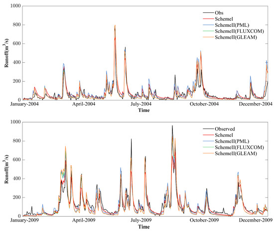 Figure 6 shows a temporal comparison of the simulated and observed daily runoff for the calibration (2004) and validation (2009) periods. The figure shows that the DHSVM model calibrated by all three variants of Scheme II can generate reliable runoff simulations. Compared to Scheme I, peak flow simulation based on all three Scheme II variants is greatly improved in the calibration and validation periods. For instance, the observed peak flow is 823 m3/s in June 2009, and the model-generated simulated peak flows are 570 m3/s, 585 m3/s, and 595 m3/s under Scheme II (PML), Scheme II (FLUXCOM), and Scheme II (GLEAM), respectively, while the model under Scheme I generates a simulated peak flow of 468 m3/s. Furthermore, for the peak flow in August 2009, the observation is 965 m3/s; for the model under Scheme I, the simulated peak flow is 643 m3/s, while, for the model under Scheme II, the simulated peak flows are 779 m3/s, 821 m3/s, and 849 m3/s for PML, FLUXCOM, and GLEAM, respectively. The improvement shown in Figure 6 is consistent with the reduction in PBIAS in the validation period presented in Table 4. Overall, the three remote sensing-based ET datasets have the ability to successfully improve the hydrological model simulations at the daily temporal resolution, and PML shows the best improvement in hydrological model performance, followed by GLEAM and FLUXCOM.