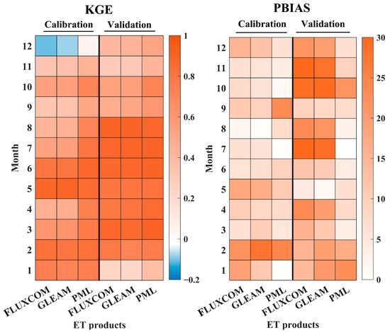 Regarding the monthly temporal resolution, KGE and PBIAS values for runoff simulation at different months from all three Scheme II variants are shown in Figure 7. From this figure, it can be observed that the majority of months show good performance, with high KGE and low PBIAS. In terms of KGE, around 58.3%, 58.3%, and 83.3% of months in the calibration period are higher than 0.5 based on Scheme II (FLUXCOM), Scheme II (GLEAM), and Scheme II (PML), respectively. In the validation period, the percentages of months with KGE higher than 0.5 are 83.3% for PML, followed by FLUXCOM (66.7%) and GLEAM (66.7%). As for PBIAS, the percentages of months with PBIAS lower than 25% are 75%, 75%, and 100% for FLUXCOM, GLEAM, and PML in the calibration period, respectively. For the validation period, the percentages are increased to 100%, 91.7%, and 100% for FLUXCOM, GLEAM, and PML, respectively.