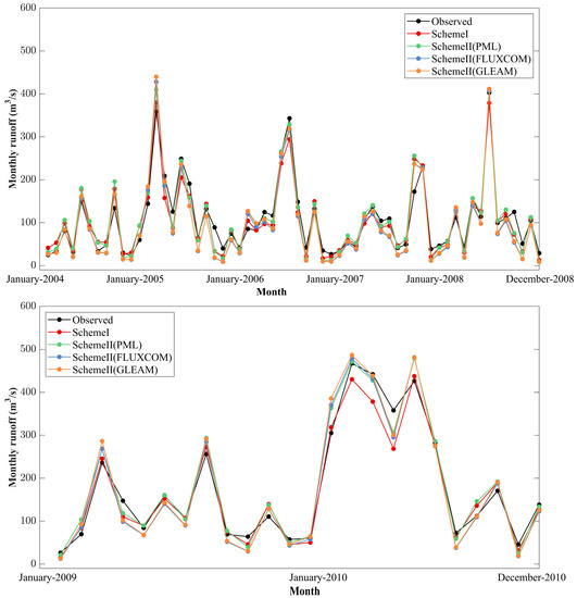 Regarding the daily temporal resolution, Table 4 presents the evaluation indices of runoff and ET simulations. As shown in Table 4, the performance of runoff simulations based on all three variants of Scheme II is comparable with that based on Scheme I. The KGE values of the runoff simulations based on all three variants of Scheme II are above 0.72 in the calibration period and above 0.85 in the validation period. Furthermore, the value of KGE reaches up to 0.91 in the validation period under Scheme II, and the value is higher than that under Scheme I. In addition, compared to Scheme I, the PBIAS in the validation period for all three Scheme II variants is slightly reduced, but not for the calibration period. A similar situation occurs for ME. The R values under Scheme II are almost the same as that under Scheme I. For RMSE, the values based on Scheme II are slightly increased, but they are still acceptable. For the three ET datasets, the runoff simulation based on Scheme II (PML) has the highest KGE and lowest PBIAS in the calibration period, which are 0.87 and 1.46%, followed by those based on Scheme II (GLEAM) (KGE = 0.75, PBIAS = 9.34%) and Scheme II (FLUXCOM) (KGE = 0.72, PBIAS = 11.82%). Moreover, the RMSE and ME values of the runoff simulation based on Scheme II (PML) are the lowest in the calibration period (RMSE = 74.72, ME = 1.56), followed by those based on Scheme II (GLEAM) (RMSE = 76.10, ME = −9.98) and Scheme II (FLUXCOM) (RMSE = 75.16, ME = −12.62).
