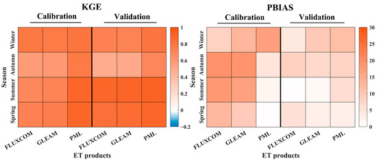 At the seasonal scale, KGE and PBIAS values for runoff simulations based on Scheme II are compared in Figure 9. In the figure, it is obvious that all three variants of Scheme II present good performance in the four seasons, with high KGE (>0.5) and low PBIAS (<20%). As for KGE, the three ET datasets perform comparably well in spring, summer, and winter, next to autumn, in the calibration and validation periods. Similar conclusions can be derived for PBIAS. Among the three ET datasets, PML performs better than GLEAM and FLUXCOM. The runoff simulation based on Scheme II (PML) has the highest KGE for the four seasons (KGE_Spr = 0.88, KGE_Sum = 0.89, KGE_Aut = 0.77, KGE_Win = 0.81) in the calibration period, followed by Scheme II (GLEAM) (KGE_Spr = 0.75, KGE_Sum = 0.71, KGE_Aut = 0.59, KGE_Win = 0.77) and Scheme II (FLUXCOM) (KGE_Spr = 0.73, KGE_Sum = 0.69, KGE_Aut = 0.58, KGE_Win = 0.78). Similar conclusions can be drawn for the validation period. Furthermore, the runoff simulation under Scheme II (PML) has the lowest value of PBIAS in the calibration period, which is 5.9% for the average value of the four seasons, followed by Scheme II (GLEAM) (14.3%) and Scheme II (FLUXCOM) (14.5%). Meanwhile, the average PBIAS values of the four seasons in the validation period are 7.1%, 5.2%, and 4.6%, respectively.