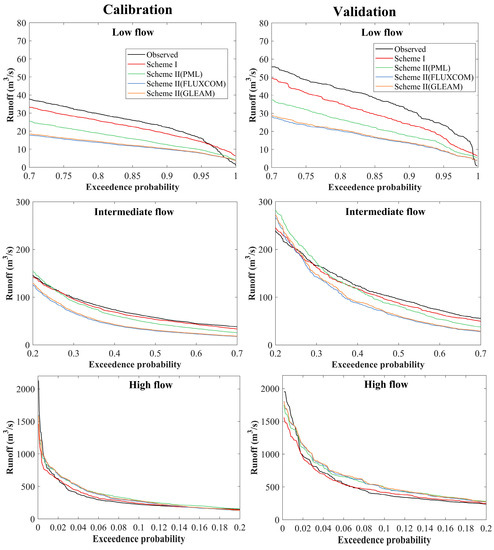 Figure 10 compares the three segments of observed and simulated runoff based on Scheme I and Scheme II. In this figure, it is obvious that the simulated intermediate flow and high flow based on Scheme I and the three variants of Scheme II are much closer to the observation than the low flow. In the calibration period, the simulated low flow and intermediate flow under all calibration schemes tend to be underestimated, and a similar conclusion can be obtained for the validation period. Thus, it is essential to improve the performance of low flow simulations under Scheme I and Scheme II. Compared to Scheme I, the simulated low flow located in the range of exceedance probability 0.97–1.0 (namely, extremely low flows) based on the three variants of Scheme II performs better in the calibration period, and the better performance in the validation period occurs in the range of exceedance probability 0.99–1.0. Furthermore, the simulated intermediate flow located in the range of exceedance probability 0.23–0.26 under Scheme II (PML) is more consistent with the observations in the calibration period. A similar conclusion can be obtained for the validation period when the exceedance probability is within 0.30–0.39. Moreover, the better performance of intermediation flow simulations based on Scheme II (FLUXCOM) and Scheme II (GLEAM) also can be found in the validation period, when the ranges of exceedance probability are 0.22–0.24 and 0.25–0.27 for Scheme II (FLUXCOM) and Scheme II (GLEAM), respectively. The improvement in hydrological model performance based on the three variants of Scheme II is indeed confirmed by their high flow simulations. When the exceedance probability is within 0–0.012—namely, extremely high flows—the runoff simulations based on the three variants of Scheme II outperform that based on Scheme I in the calibration period. In the validation period, a similar improvement can be observed clearly in Figure 10.