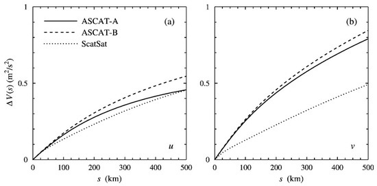 Difference between the spatial variance of ASCAT-A, ASCAT-B, and ScatSat and that of ECMWF, , as a function of for the zonal wind component (a) and for the meridional wind component (b).