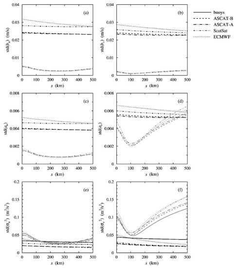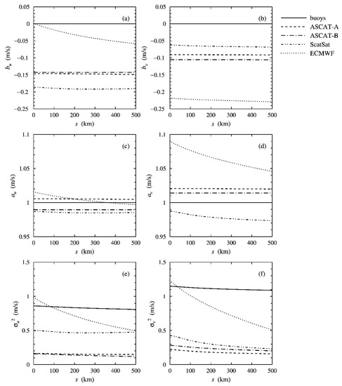 Note that the spatial variances and should be divided by the square of the calibration scaling before calculating the representativeness errors and applying (15) in order not to mix up calibrated and uncalibrated quantities when applying the iterative scheme presented in Section 3.3. Note also that the curves for ASCAT-A and ASCAT-B are not identical. This is due to the time difference of about 50 min in the local overpass time between the two sensors, mainly due to a different orbit phase. They, therefore, sample different weather at a particular phase of the diurnal cycle (both sensors are in a mid-morning sun-synchronous orbit). When mesoscale turbulent processes play a role, ASCAT-A and ASCAT-B can give quite different wind fields [18].