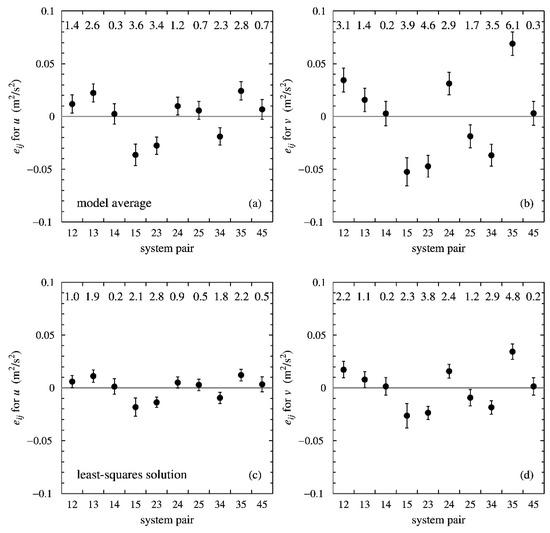 Figure 5 shows the observation error covariances averaged over all models (a, b) and obtained from the least-squares solution (c, d), with the representativeness errors evaluated at km for and km for . The model average is, of course, taken only over those error covariances that are a solution of the model under consideration. The dots give the values of the error covariances, while the error flags indicate their statistical accuracy. System 1 stands for the buoys, system 2 for ASCAT-B, system 3 for ASCAT-A, system 4 for ScatSat, and system 5 for the ECMWF forecasts. The numbers along the top of each panel give the absolute value of the error covariance in units of its standard deviation to indicate the statistical significance.