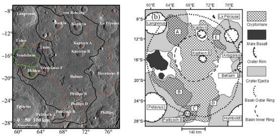 The B-K region contains one of the largest cryptomare deposits [5,6] on the Moon. Noting the presence of DHCs, the association with mafic geochemical anomalies, and the presence of a significant component of mare basalt in high-albedo surface units, Hawke et al., [5] determined the distribution and extent of the cryptomare deposits in the B-K region (Figure 2b). All the cryptomare regions are located within the outer ring of the B-K basin in a cross-hatched pattern, and the inner ring is wholly underlined by the mare deposits. The B-K cryptomare region was mainly formed by basin impact ejecta, including Mare Serenitatis and Mare Smythii [6]. Additionally, the cryptomare surfaces in the northern portion were contaminated by discontinuous highland-rich ejecta from the Langrenus (61.0°E, 8.9°S) and La Pérouse (76.3°E, 10.7°S) craters, while in the southern portion, the cryptomare surfaces were contaminated by highland-rich ejecta mainly from the Petavius (60.5°E, 25.2°S), Palitzsch B (68.4°E, 26.4°S), and Humboldt (81.0°E, 27.0°S) craters [5].