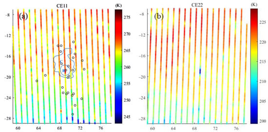 According to the calculated hour angles, the data points were divided into 24 intervals corresponding to 24 h in a lunation. The data points from 4:00 to 5:00, 6:00 to 7:00, 9:00 to 10:00, 11:00 to 12:00, 13:00 to 14:00, 17:00 to 18:00, 20:00 to 21:00, and 22:00 to 23:00 were sufficient to generate TB maps covering the whole B-K region. In this study, the data points from 11:00 to 12:00 and from 22:00 to 23:00 (as shown in Figure 3) are used to map the B-K region at noon and night, representing two nearly extreme values over the lunar surface.