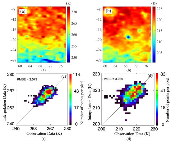 TB maps of the B-K region at 37 GHz at noon (a) and night (b), and comparisons of observation data and interpolation data at noon (c) and night (d).