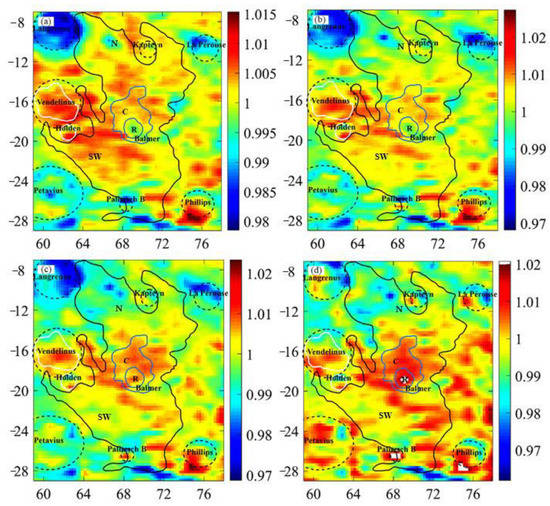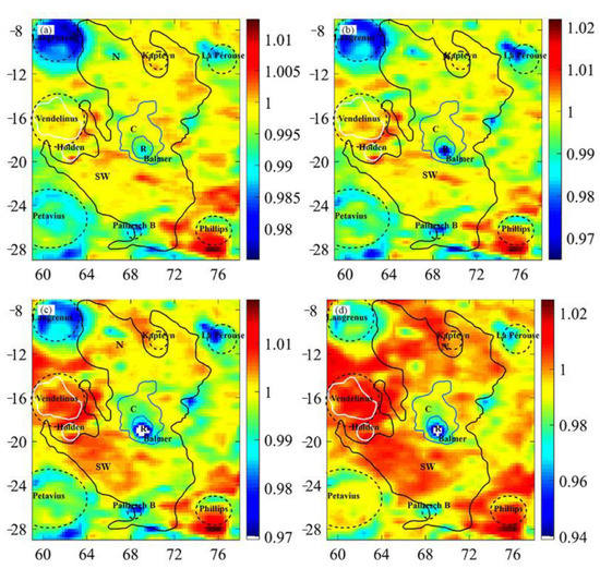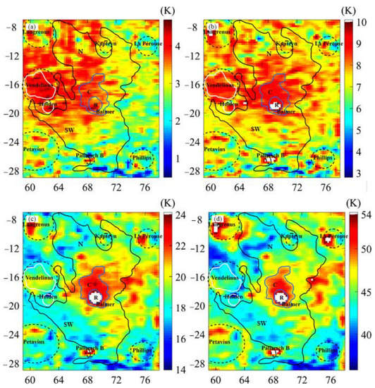 Compared with the TB maps, the latitude-dependent effect was also substantially weakened in the dTB maps, which was clearly illustrated by the values along the longitude beyond the cryptomare region. To date, MRM data have not been employed to evaluate cryptomare deposits on the Moon. Thus, it is difficult to evaluate the reasonableness of the generated maps. Interestingly, Figure 7d shows that the dTB values were well limited within the Langrenus crater, La Pérouse crater, Palitzsch crater B, and several other craters, where the crater rims were also the boundaries of the relatively higher and lower nTB values corresponding to the enhanced and decreased solar illuminations. This suggests the appropriateness of TB values in geographical positions.
