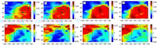 nTB maps in the Rümker region [22] at noon: (a) 3.0 GHz, (b) 7.8 GHz, (c) 19.35 GHz, (d) 37 GHz; and at night: (e) 3.0 GHz, (f) 7.8 GHz, (g) 19.35 GHz, (h) 37 GHz. The black line denotes the Em4 unit with the highest FTA.
