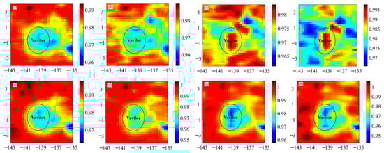 Figure 4 shows that the change in the 37-GHz TB in the direction of latitude was more than 20 K both at noon and at night, which was much larger than that in the direction of longitude with similar solar illumination. In Figure 5 and Figure 6, the change in the nTB in the direction of latitude was weakened. Additionally, the change in the nTB in the direction of latitude was similar to that in the direction of longitude, also indicating that the variation in the nTB in the direction of latitude is effectively weakened. The nTB maps provide a different view of the surface deposits in the B-K region compared with the optical images.