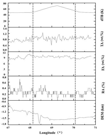 The dTB, TiO2 abundance (TA), FeO abundance (FA), rock abundance (RA), and surface elevation (DEM) values along the black profile are shown in Figure 11a. The black dotted line is the TB anomaly in Region R.