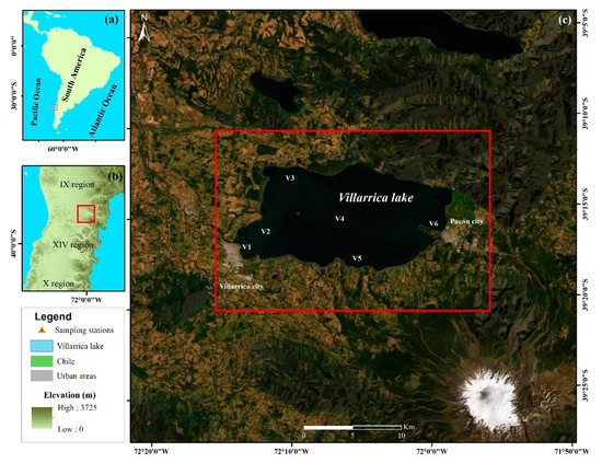 (a) Chile in South America, (b) location of Lake Villarrica in the 9th Region, and (c) satellite image of Lake Villarrica with sampling stations V1–V6, represented by yellow triangles. The grey areas represent the cities on the lake shore. Satellite image extracted from Landsat 8.