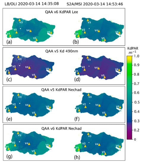 Estimation of KdPAR in Lake Villarrica using four algorithms in (a,c,e,g) L8/OLI and (b,d,f,h) S2A/MSI images from 14 March 2020.