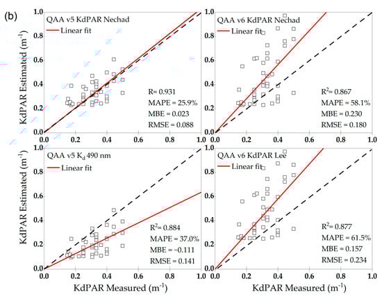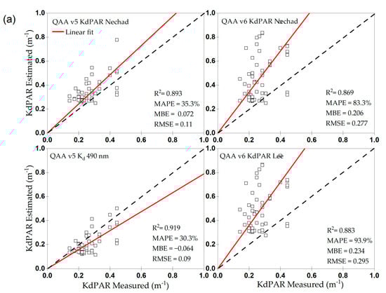 The analysis revealed that the coefficient of determination was large (R2 ≥ 0.867) when the selected algorithms were used in both seasons, which are shown in Figure 3. Indicating a relatively good level of agreement between measured and estimated KdPAR values. The v6 algorithm tends to fit a positive exponential function, departing from the 1:1 line, while v5 algorithm is a relatively closer fit to the 1:1 line. The MAPE ranged between 25.9–93.9% (QAA v5 KdPAR Nechad-QAA v6 KdPAR Lee) for spring and summer, respectively. Based on the MAPE indicator, the worst results with significantly different values from their measured counterparts were presented by QAA v6 KdPAR Lee. Similarly, the highest RMSE (0.19 m−1) was found in summer using the QAA v6 KdPAR Lee and QAA v6 KdPAR Nechad algorithms, while the lowest RMSE (0.02 m−1) was found in spring using the QAA v5 KdPAR Nechad algorithm. The average bias (positive result in most cases) ranged between 0.023 m−1–0.234 m−1, with higher over-estimates (0.157 m−1 and 0.234 m−1) found using the QAA v6 KdPAR Lee in spring and summer, respectively. This is probably because in the case of Lee’s algorithm version 6 a wavelength reference of 667 nm was proposed for water with Rrs(670) > 0.0065 sr−1, i.e., water with higher concentrations of Chl-a [30]. Thus, the algorithm version 6 is not suitable for Lake Villarrica. Therefore, results indicate that the algorithm version 5 can provide reliable/fair predictions of KdPAR during summer and spring.
