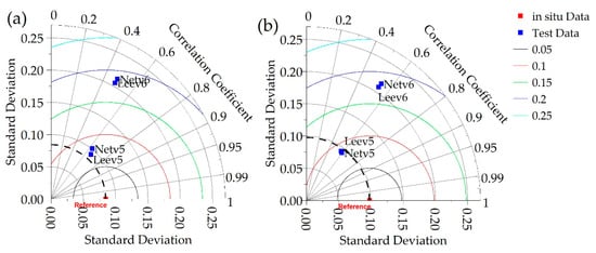 Comparison of the performance of the algorithms used for the two study seasons—(a) summer and (b) spring—using a Taylor diagram. Where: Netv5 (QAA v5 KdPAR Nechad), Netv6 (QAA v6 KdPAR Nechad), Leev5 (QAA v5 Kd 490 nm), and Leev6 (QAA v6 KdPAR Lee).