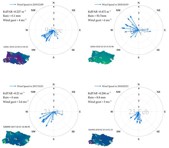 To further investigate the contribution of several meteorological parameters to the estimation of KdPAR, a qualitative analysis was performed. Figure 6 shows the selected satellite days, representing spring and summer. On the selected days the predominant wind direction was toward the SW and NW, reaching a maximum speed of 3.4 ms−1 (28 February 2020), while the lowest daily mean corresponded to a light westerly breeze of 0.88 ms−1, mostly toward the SW (26 November 2020). The selection of days 28 February 2020 and 19 October 2018 provided evidence that episodes of strong wind, perhaps Puelche wind, can force significant mixing in the water column, resulting in a change in the thermal structure of the lake and the vertical transport of nutrients from the thermocline, which can increase lake productivity [40] and KdPAR values. Therefore, some high KdPAR values are associated with strong wind due to sediment resuspension. Thus, Lake Villarrica may be more vulnerable to eutrophication resulting from these local meteorological conditions. In the satellite image from 19 October 2018, KdPAR distribution was observed after days of heavy rainfall, which totaled 50 mm. This rainfall, together with wind speeds higher than 2 ms−1 and gusts of 6 ms−1, can influence the distribution of KdPAR, making it practically uniform throughout the lake.